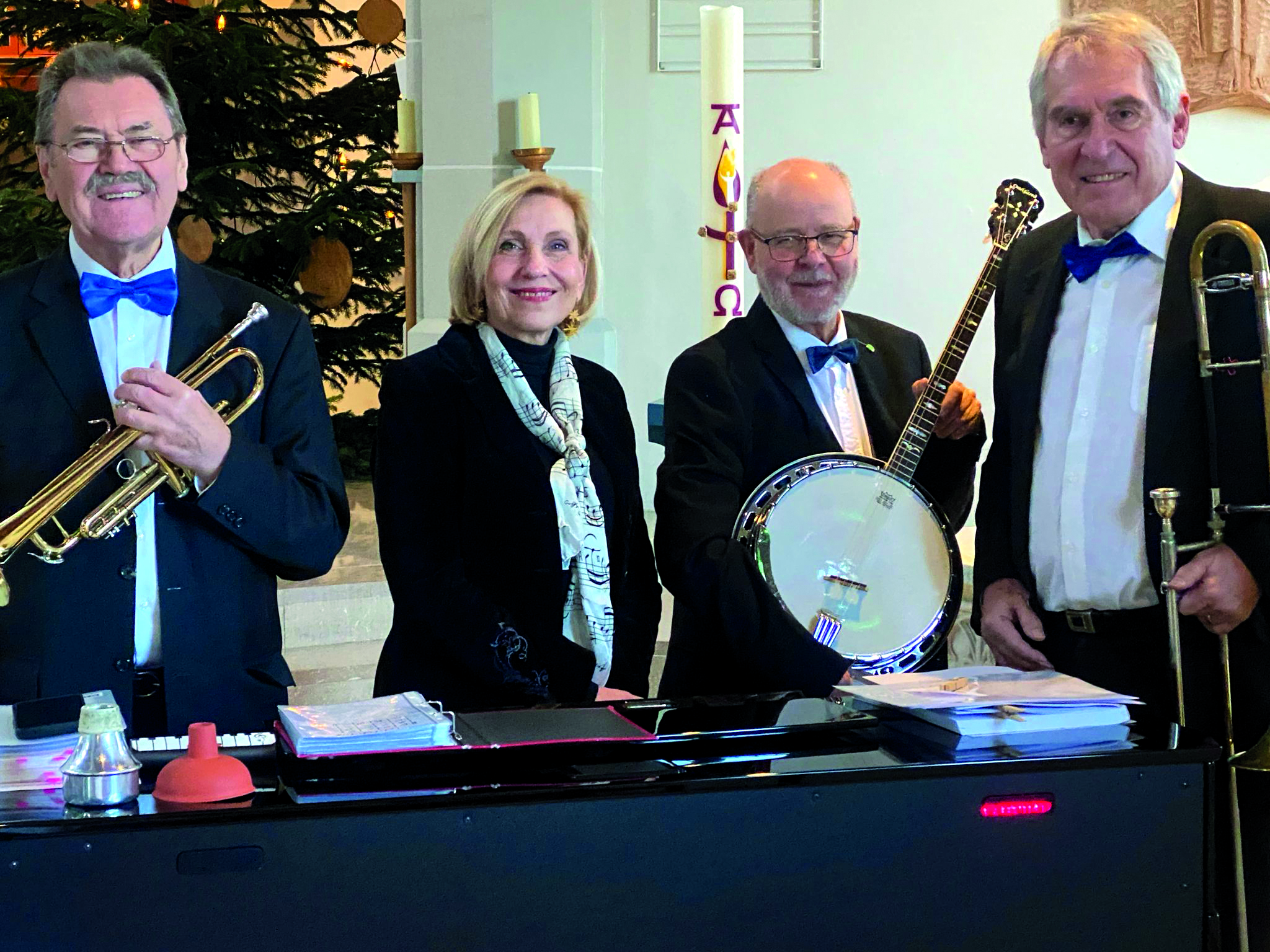 Am 1.1.2026 spielt die Blue Lions Jazzband um 16 Uhr im Jazzgottesdienst in der katholischen Kirche der Heiligen Dreifaltigkeit in Adliswil, frei nach dem Bibelzitat «…lobet Ihn mit Psalter und Harfen…» Die Band hat sich swingenden Jazz der 1920er bis 1940er Jahre auf die Fahnen geschrieben. Es wird die Jazztradition gepflegt und die Band liebt es, auch weniger bekannte Stücke im Original aufzuführen, aber auch eigene Versionen der wunderbar vielfältigen Literatur der frühen Jazz- und Swing-Ära zu spielen. Die Gospelmusik ist ein wichtiger Teil der Jazzgeschichte und wird den Gottesdienst mit ihren innigen und berührenden Klängen begleiten, nach dem Gottesdienst wird konzertant weitergejazzt. Also: runter vom Sofa, rein in die Kirche! Die Besetzung: Ivan Kubias, Trompete, Gesang; Miro Steiner, Posaune, Gesang; Heinz Glauser, Banjo, Gitarre; Ingrid Paur, Klavier.